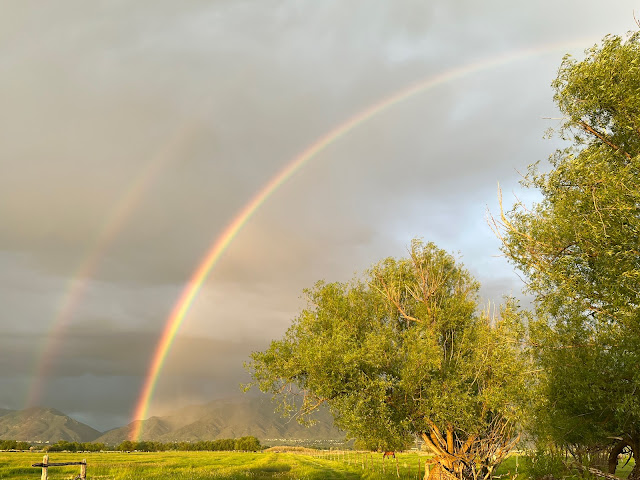 I actually have more items of a quilty nature to share, but I will save them for another post, and end with these photos of a rainbow we saw here a couple of weeks ago. My daughter-in-law (who has a degree in photography, among other things) captured this first photo of the total arc.